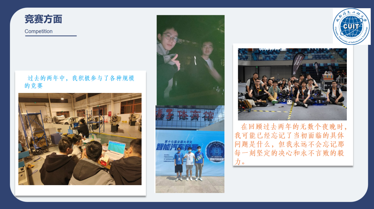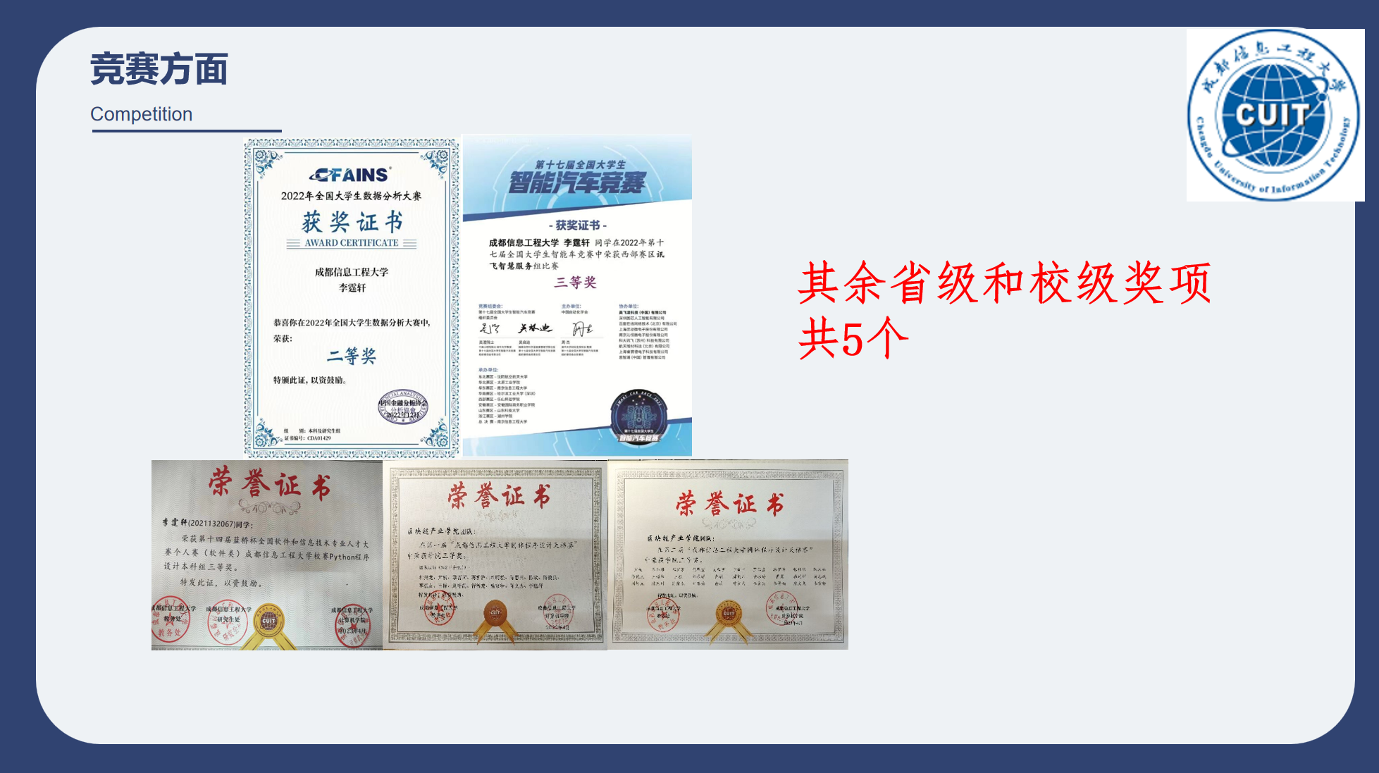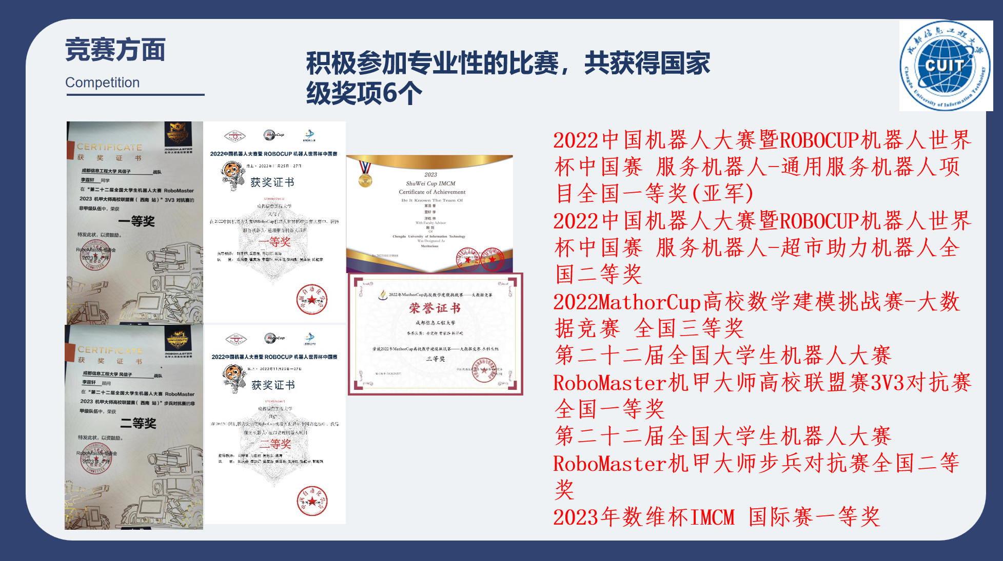 曾获2021-2022学年:第十七届全国老员工智能车竞赛省级三等奖 2022-2023学年:校级一等奖学金、优秀志愿者称号、2022 中国机器人大赛暨ROBOCUP机器人世界杯中国赛 服务机器人-通用服务机器人项目全国一等奖(亚军)、2022 中国机器人大赛暨ROBOCUP机器人世界杯中国赛 服务机器人-超市助力机器人全国二等奖、2022MathorCup高校数学建模挑战赛-大数据竞赛全国三等奖、第二十二届全国老员工机器人大赛 RoboMaster 机甲大师高校联盟赛 3V3 对抗赛全国一等奖、第二十二届全国老员工机器人大赛 RoboMaster 机甲大师步兵对抗赛全国二等奖 2023-2024学年:2023年数维杯 IMCM 国际赛一等奖