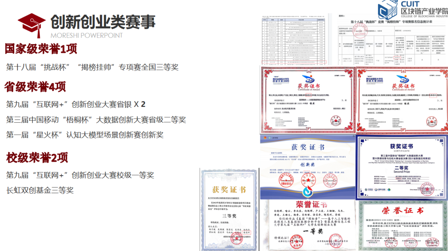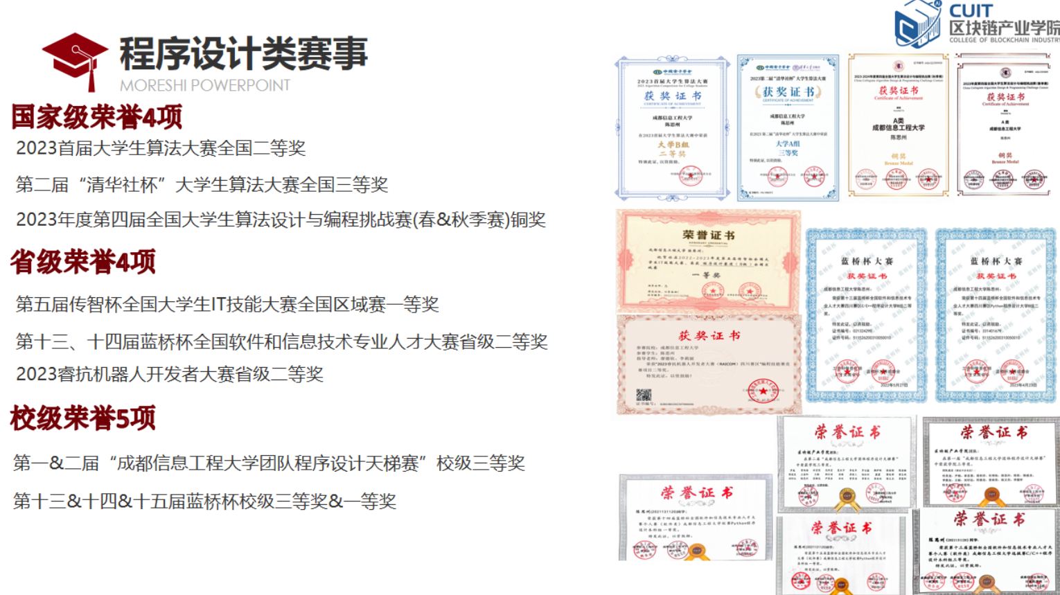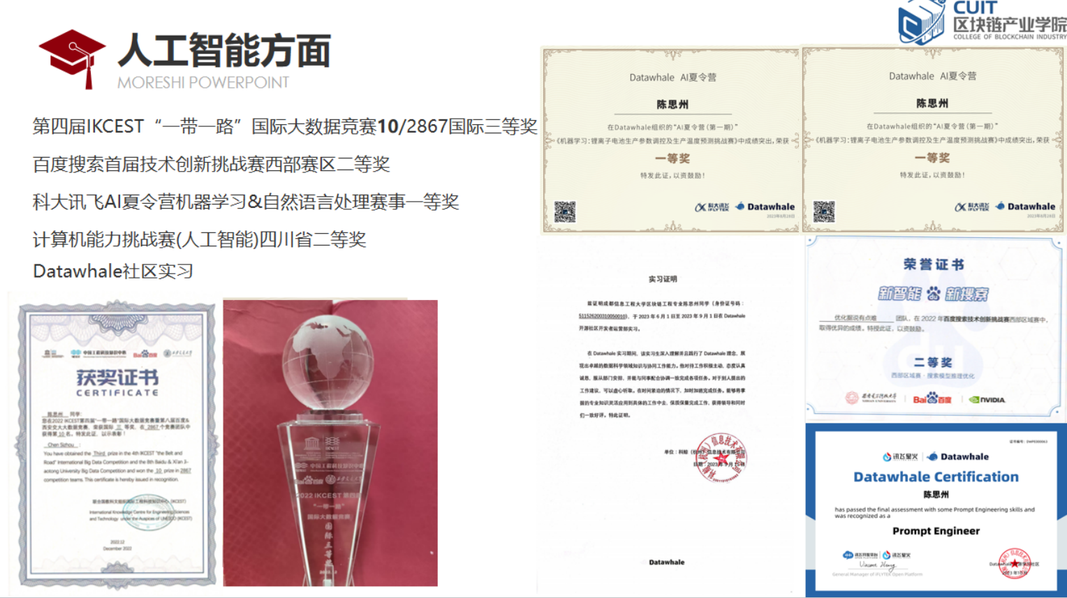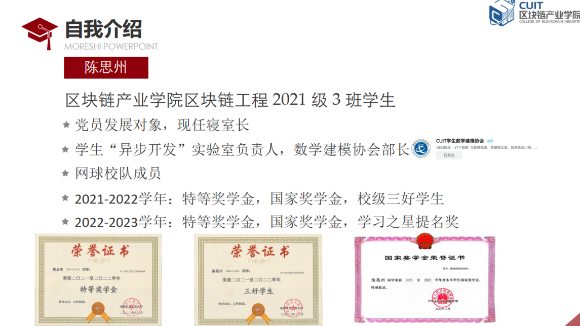 他认为,技术只是一种工具,技术的最终目的是为了满足人们对美好生活的需求。在参加相关赛事的同时,他也不忘将自己的竞赛成果转化落地从而能够回馈于社会的发展。参与第十一届软件杯全国老员工软件设计大赛的比赛成果:“基于5G服务的大数据管理平台”,“计算机数据安全交互系统”软件分别在5,7月份通过著作权审核,可落地于公共安全等领域,促进社会稳定发展。另外,在此次比赛的基础之上,他还完成了六篇学术论文。他希望自己的点滴工作能够为语音语言处理这一领域添砖加瓦。第四届“一带一路”国际大数据竞赛:法俄泰阿与中文互译,该项比赛的成果被“一带一路”倡议沿线国家交流系统的开发使用,将其应用于未来文化交流和国际贸易等行业。步入大学的一年多以来,他也在以自己的方式来履行义务承担责任。在大一时,作为“异步开发”实验室负责人,他组织暑假学习活动,带领想要学习开发知识的同学在暑假内进行任务布置与发放资料形式的学习,并带领组员共同挑战挑战杯,互联网+等竞赛项目;大二学年里,他接过飞桨深度学习社区团长一职,并在校内进行普及人工智能基础知识;大二寒假中,他组织数学建模部门的干事,共同创立bilibili的CUIT数学建模协会账号,并持续推进内容更新,目前已有4.8k的粉丝量;另外,他加入了PFCC开原框架贡献小组,和来自全球不同领域的员工、研究人员、教授以及相关从业人员一起维护国内最大的深度学习框架,他希望能够以此来为中国AI发展贡献一份自己的力量。