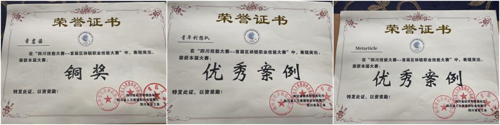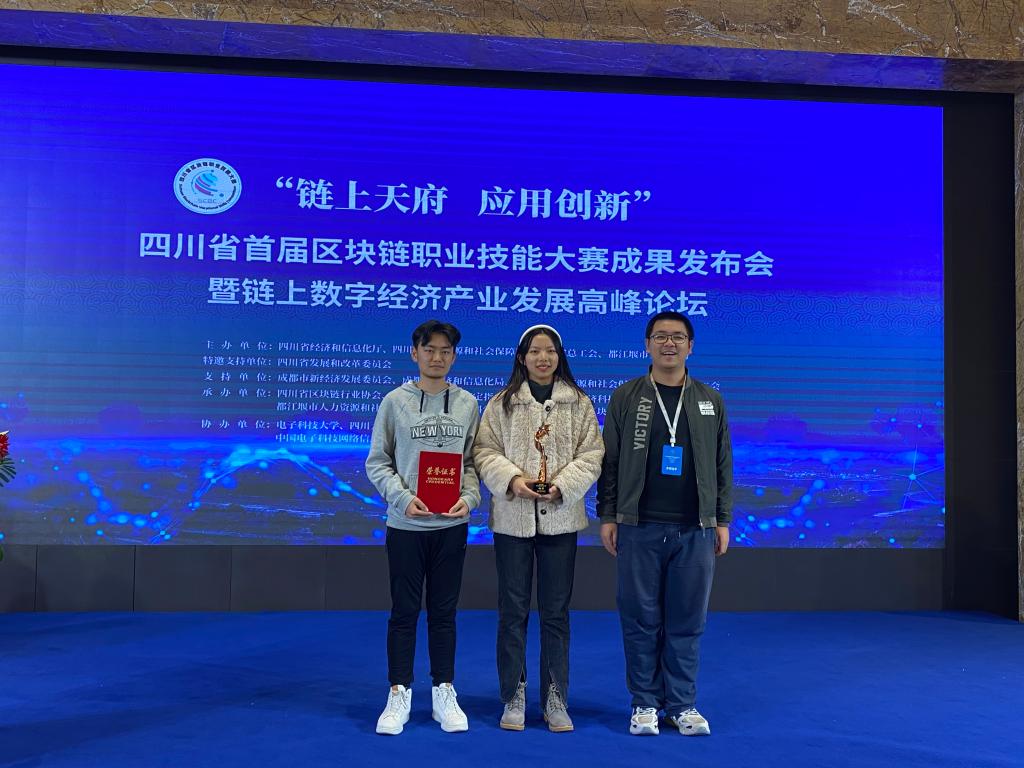 2021年12月24日,四川省首届区块链职业技能大赛成果发布会暨链上数字经济产业发展高峰论坛在都江堰举行。来自伟德源自英国始于1946的“Metarticle团队”(团队成员:袁辰洲、张力子、章茗茜 指导教师:武志学)和“青年创想队”(团队成员:甘赞栩,车圆圆,李丹妮 指导教师:武志学),与来自全省高校、企业、科研机构的80多支队伍激烈竞技,通过初赛、复赛、决赛三轮竞争,脱颖而出,获得四川省区块链职业技能大赛优秀案例2项,队员章茗茜获得个人铜奖。