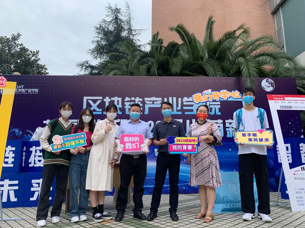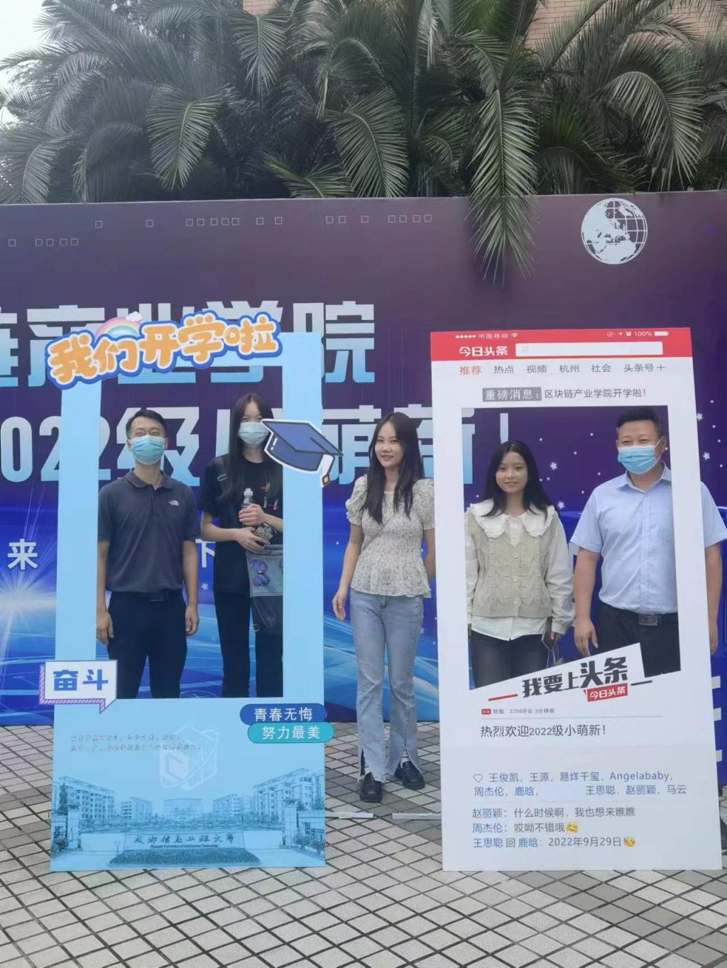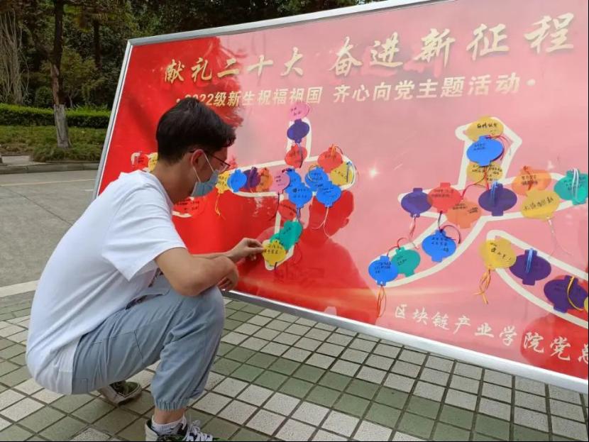 在信息楼门口,新生们热情拍照留念,在新生墙上签上自己的名字,并用自己的美好寄语喜迎二十大胜利召开!
