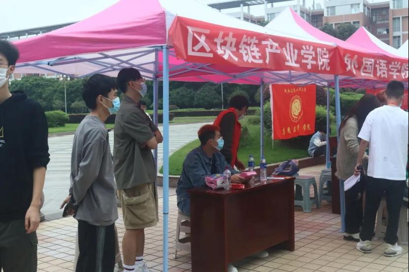 在信息楼四楼,新生们按照报到流程,在老师和学长学姐们的指引下,有条不紊地完成线下报到。