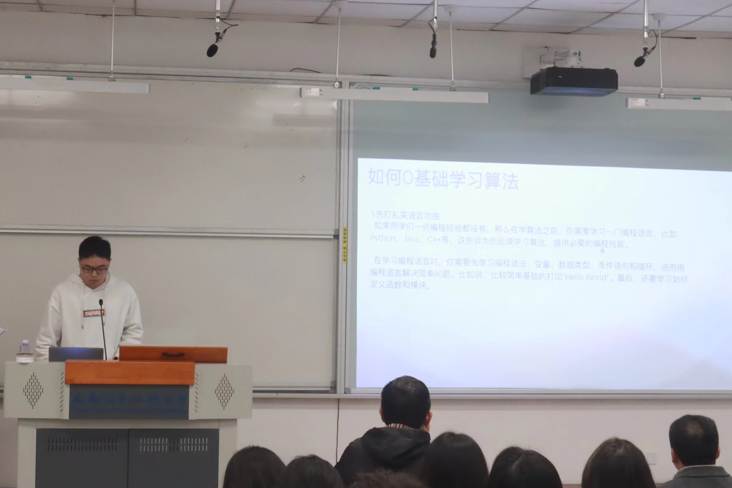 为了让同学们更好地了解如何零基础学习算法,区块链工程专业221班的常旭海同学和人工智能专业221班的张桂铭同学分别上台分享了他们的学习方法和经验。他们强调了打好语言功底、理解基本数据结构和算法的重要性,并建议同学们通过参与算法竞赛来提升自己的能力。
