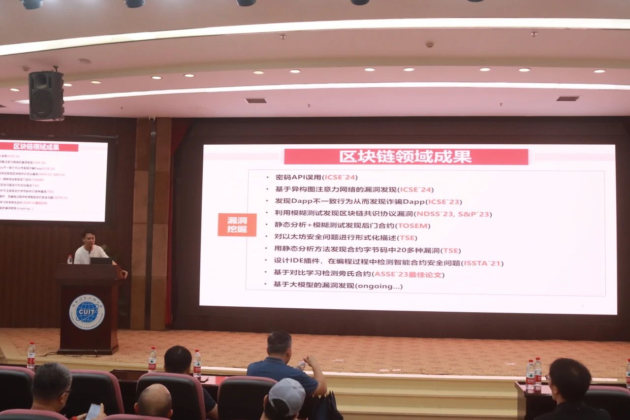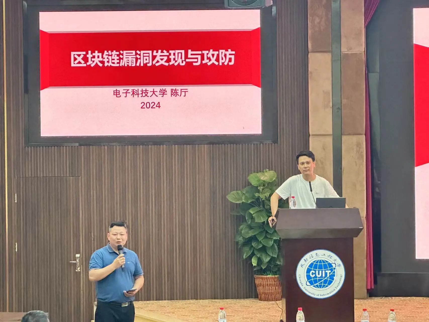 会议伊始,林细俤介绍了陈厅教授的丰富学术背景及其在区块链领域的研究成就,并对陈厅教授的到来表示热烈的欢迎。陈厅教授是区块链安全领域的知名专家,多年来一直致力于区块链安全技术的研究与应用。他在报告中详细阐述了区块链技术领域的最新研究成果,重点针对分布式应用漏洞挖掘、转账行为识别、交易分析、攻防策略、逆向工程以及交易优化等方面进行分享和介绍。他通过丰富的案例分析,向在场的师生展示了区块链系统中存在的安全挑战以及应对策略,并介绍了当下最火的人工智能技术与区块链安全结合的研究成果,帮助师生们深入理解区块链技术的安全性问题,提升对区块链安全风险的防范意识