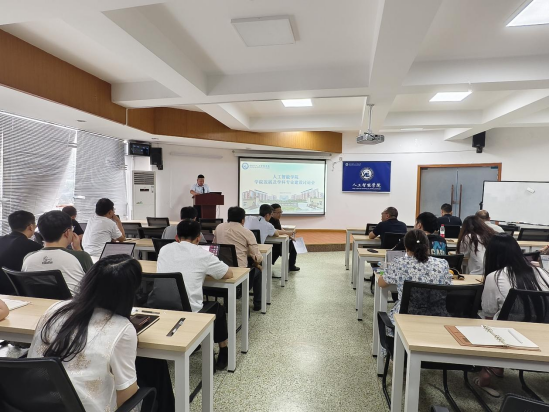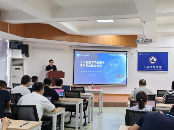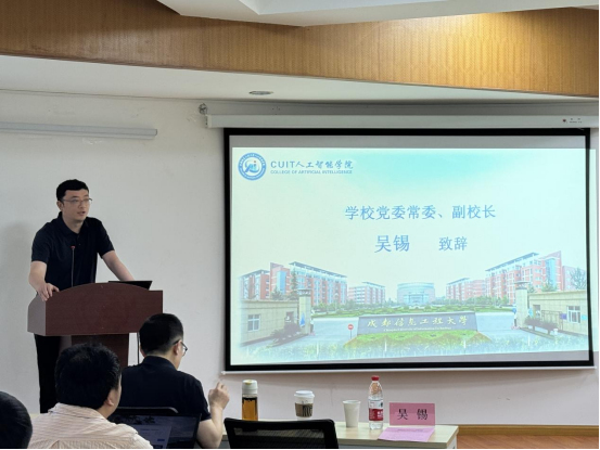 吴锡为本次会议致辞。他对学院近几年在团队建设、人才培养等方面所取得的成绩给予了充分肯定,并着重指出,在当前人工智能技术飞速发展,且广泛应用于各领域的大背景下,学院应牢牢把握机遇,迎接挑战,进一步强化学科专业特色建设,持续提升人才培养质量。同时他以自身经历勉励学院教职工要有进取精神,杜绝“躺平”,抓准时代机遇,结合学校特色优势提升自身的教学科研水平。