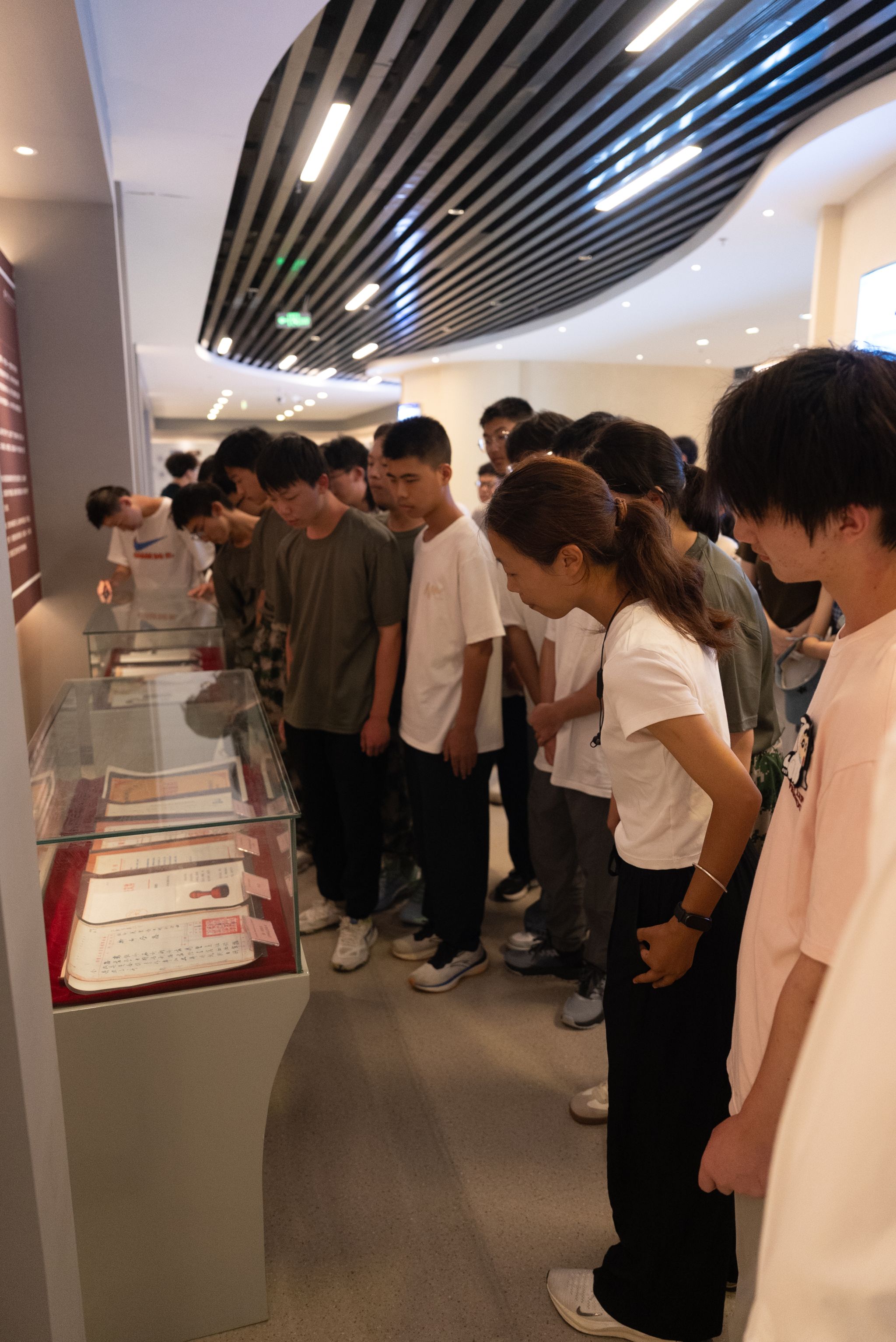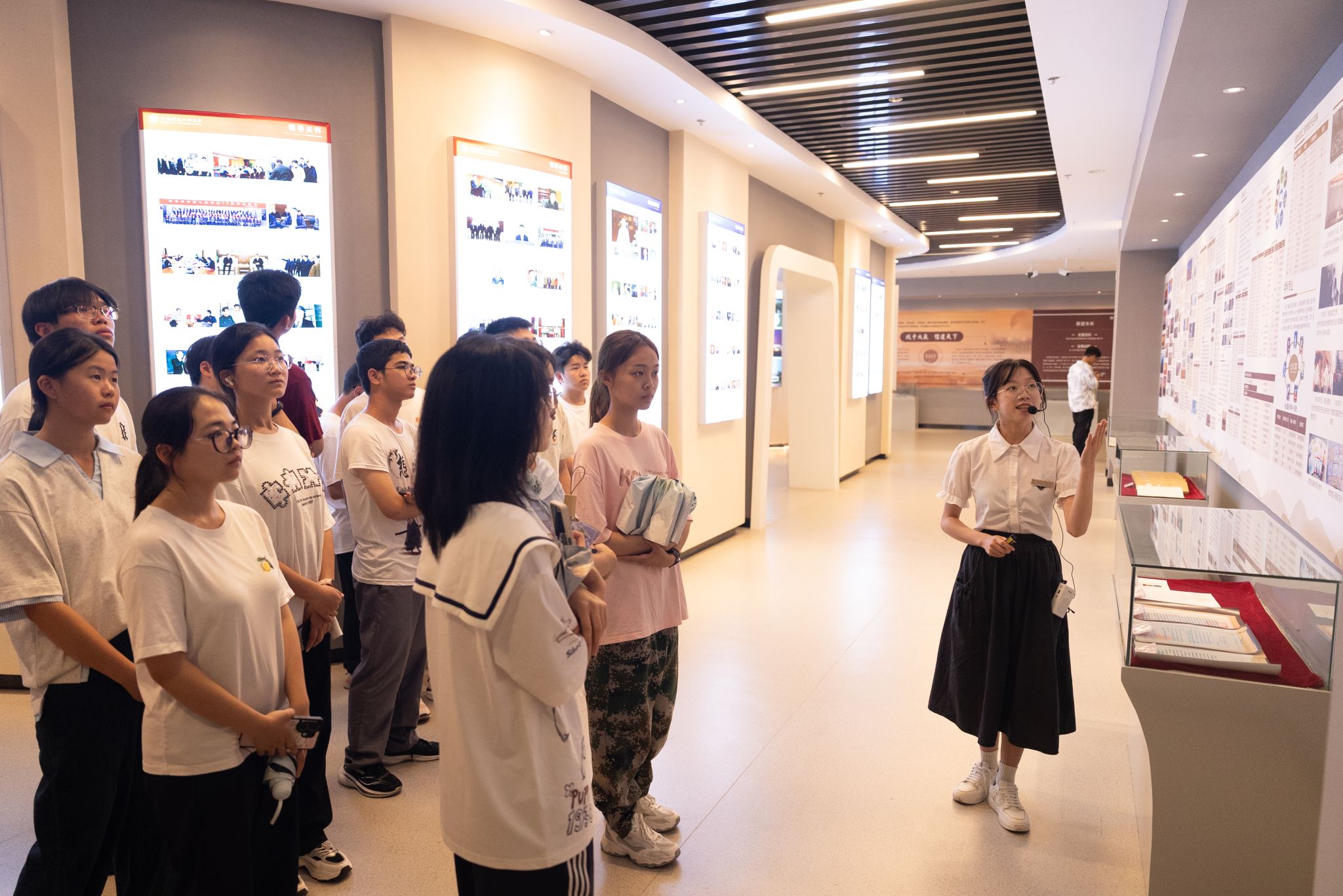 新生们在讲解员的引导下有序进入校史馆。展馆内陈列的建校初期教学用具、手写教案、科研成果实物等珍贵展品,生动再现了学校不同历史时期的发展面貌。