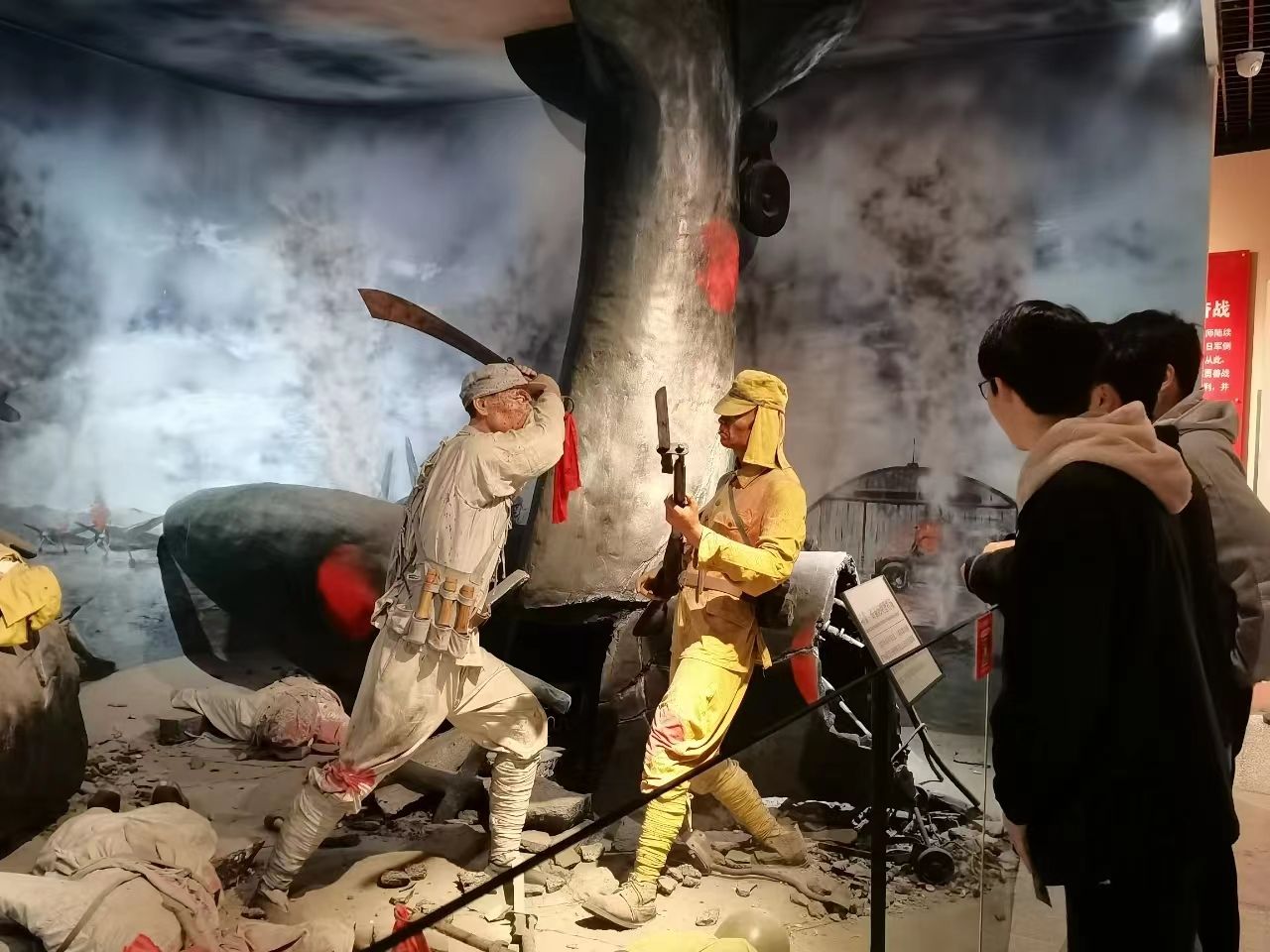 紧接着同学们来到了川军抗战馆,该馆建筑展厅面积2087平方米,分为“300 000川军出川抗战”、“3 000 000壮丁奔赴前线”两大部分,突出表现30万川军出川抗战、300万壮丁奔赴前线的历史史实。该馆主题是,尽管当时的四川是居于抗战后方,但仍然提供如此巨大的人力资源前往前线浴血奋战,为抗战做出了特殊贡献。该馆不仅在外观设计上具有显著的川西建筑风格,在展示手段上也突破了传统博物馆的设计,通过采用复原场景、沙盘模型、雕塑、绘画、浮雕、多媒体放映等多种艺术手段,给人以视觉的冲击和爱国主义精神的启迪。