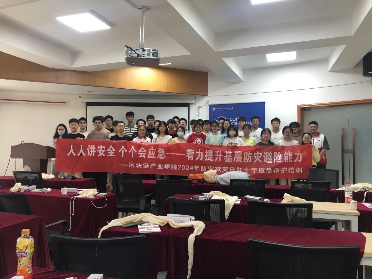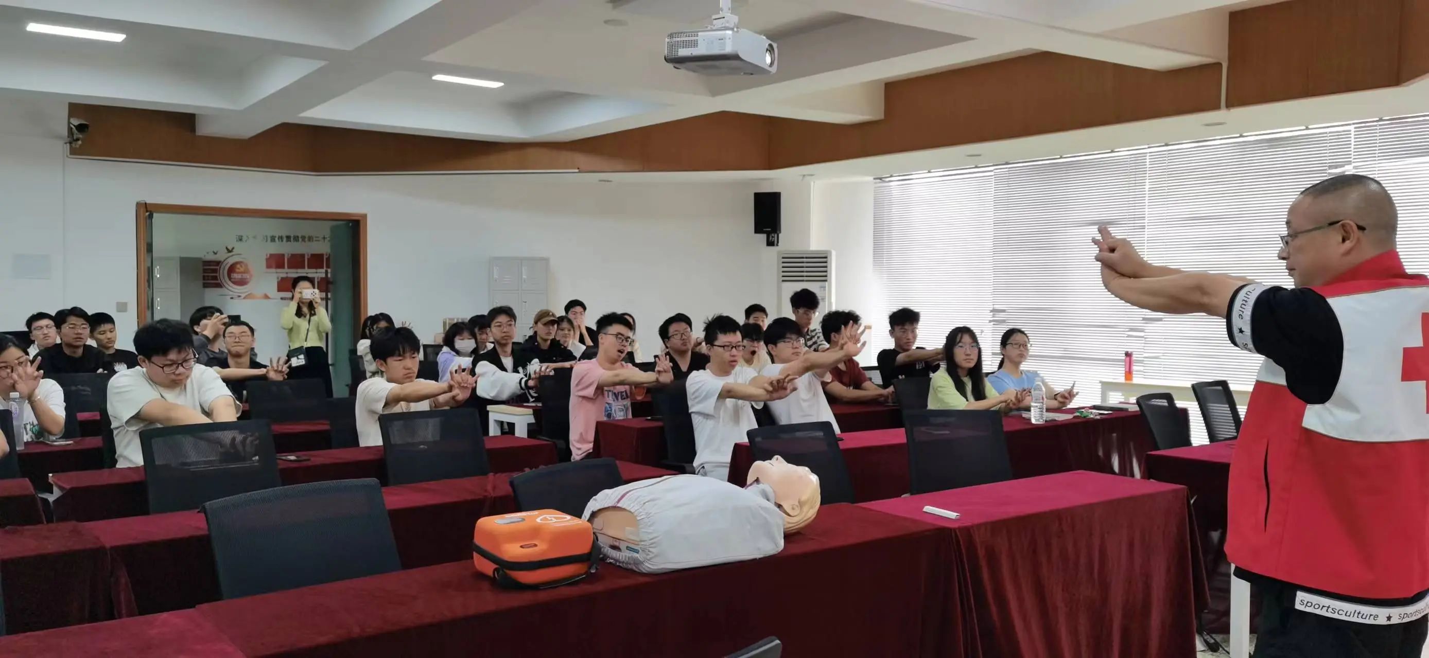 本次培训通过理论讲解和实际操作相结合的方式进行,由成都市红十字会应急救护培训师徐文春和李佳阳老师主讲。徐老师通过图文并茂的方式,向同学们讲授了心肺复苏、气道异物梗阻解除、止血包扎、骨折固定、紧急情况下如何拨打120急救电话、自动体外除颤仪(AED)的正确使用等等急救技能,并重点介绍了心肺复苏术和海姆立克急救法的具体操作流程。理论学习后,每位同学都上台进行演练,加深对急救技能的印象。