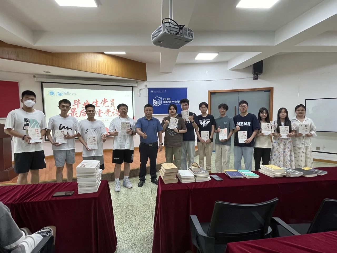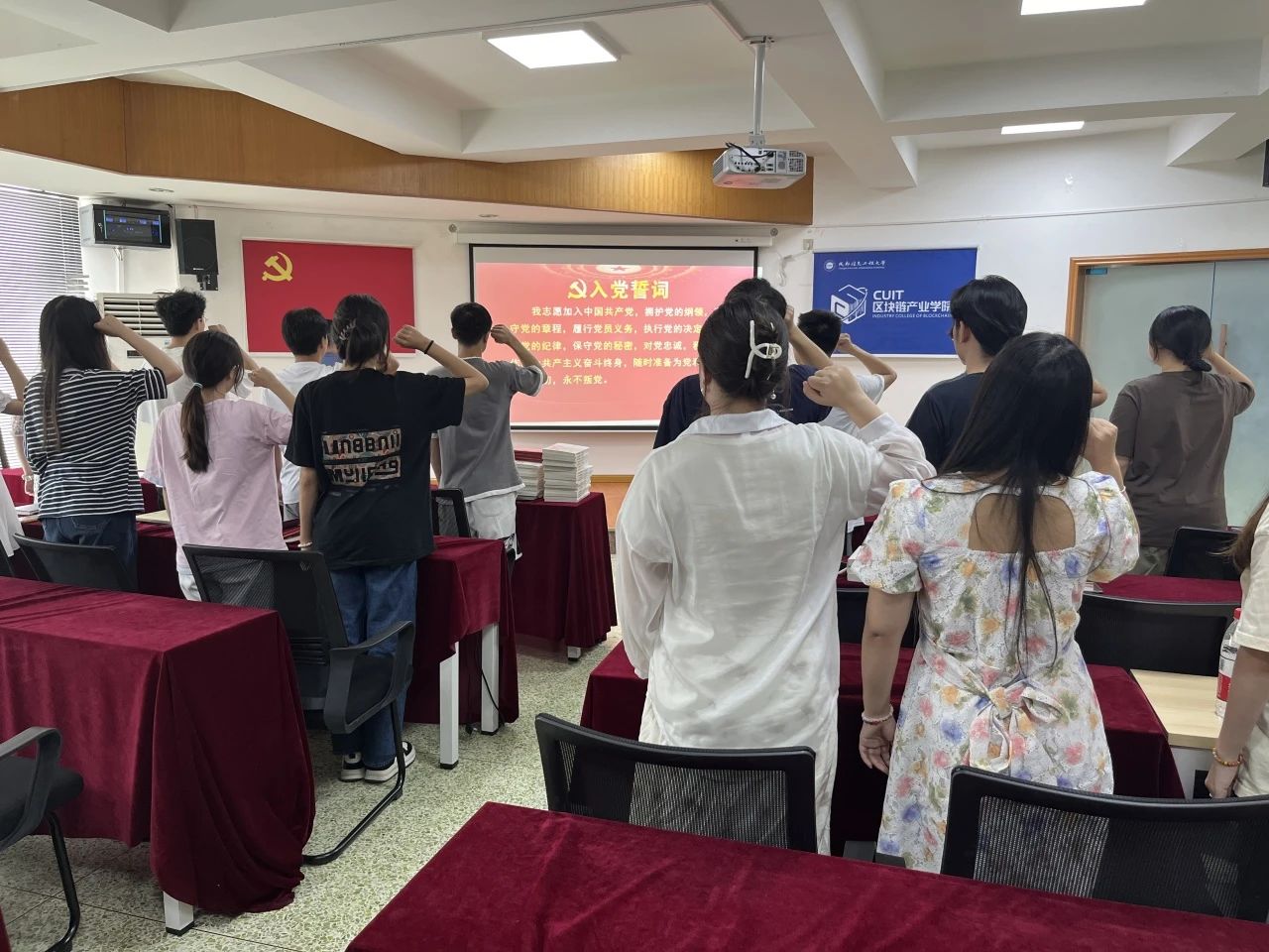 赠书仪式后,在林细俤的带领下,全体毕业生党员再一次面对党旗,重温了一次入党誓词。通过重温入党誓词,引导广大毕业生党员铭记党员身份,增强党员意识,不断增强社会责任感、创新精神,走向社会后,不忘初心、砥砺前行、努力工作,践行党员承诺。