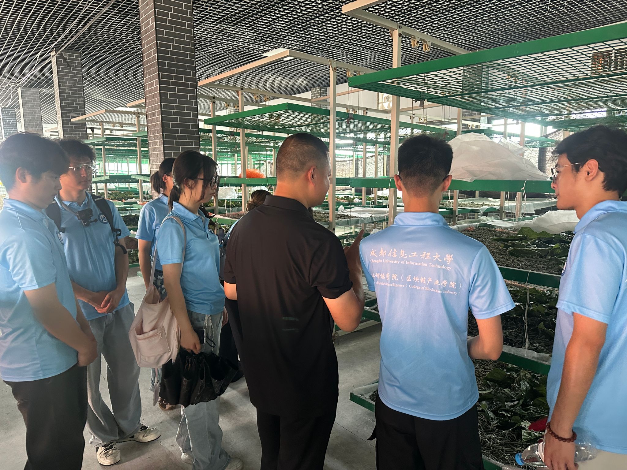 在武胜县蚕桑现代农业园区,实践团详细了解该园区蚕桑养殖的创新做法。通过引入智能养蚕机器人、环境调控系统与蚕茧检测设备,自动完成喂桑和消毒工作,精准控制环境参数,提升管理效率。